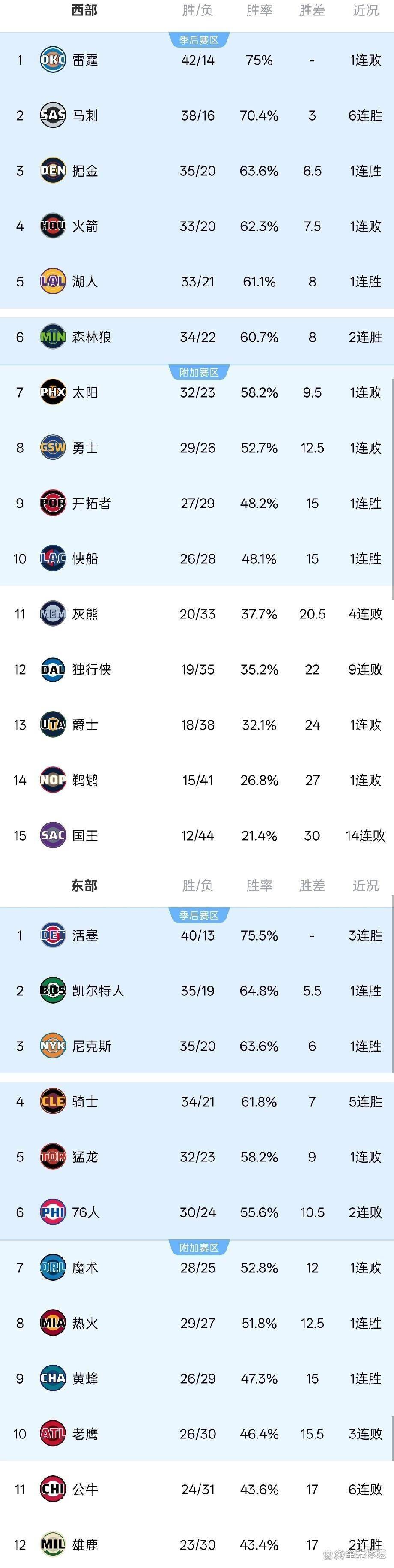 2026年2月13日的比赛全部结束后,NBA的排名发生了清晰可见的变化。底特律活塞队以75.5%的胜率,取代了75%胜率的俄克拉荷马雷霆队,成为了新的全联盟第一,书写了一段传奇。在西部,雷霆队虽然仍排名第一,但领先优势已经荡然无存;丹佛掘金队位列第三,休斯顿火箭队紧随其后排在第四位。洛杉矶湖人队凭借着对独行侠队的胜利,反超森林狼队升至西部第五,提升了球队的排名。菲尼克斯太阳队排在第七,金州勇士队位列第八,依旧保持着对季后赛席位的冲击。而战胜爵士队的波特兰开拓者队,则再次反超洛杉矶快船队,上升到了西部第九的位置,看到了晋级季后赛的希望。达拉斯独行侠队在输给湖人队后,遭遇了尴尬的九连败,球队的士气跌至谷底。这真是一个体育迷们欢欣鼓舞的特别日子。